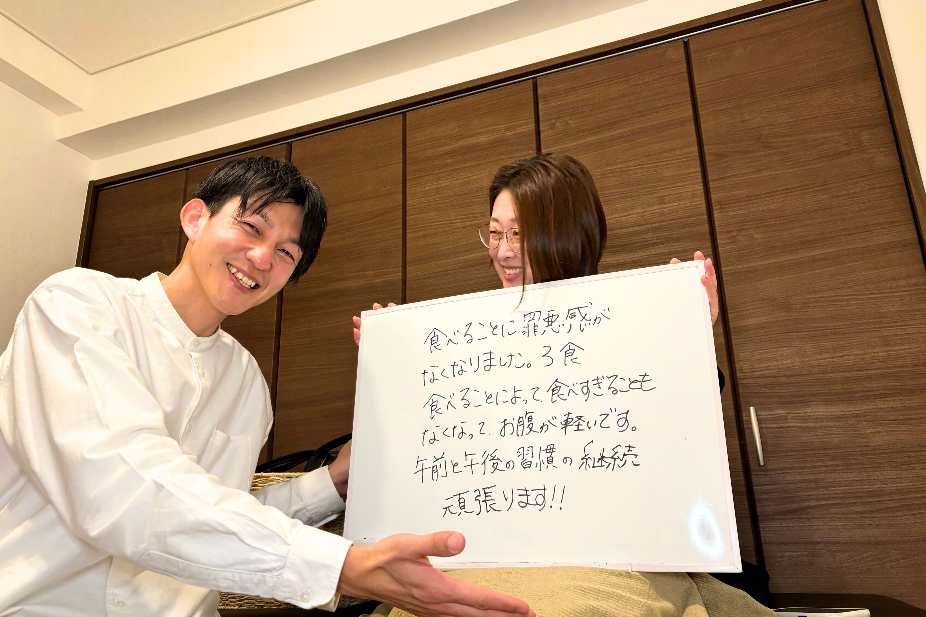 食べることに罪悪感がなくなりました。3食食べることによって、食べ過ぎることもなくなってお腹が軽いです。午前と午後の習慣の継続頑張ります!! |