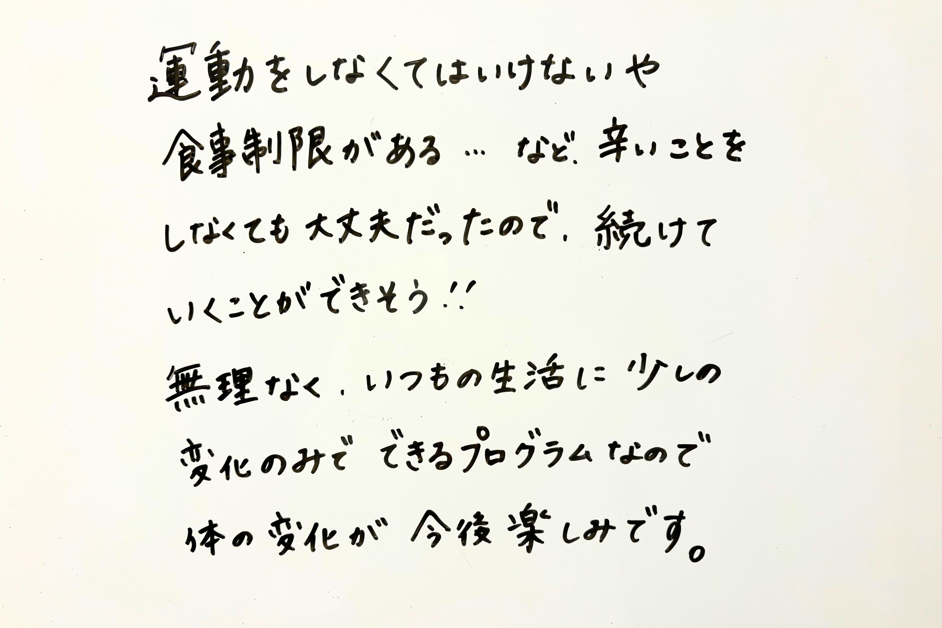 運動をしなくてはいけないや食事制限がある…など辛いことをしなくても大丈夫だったので、続けていくことができそう!! 無理なくいつもの生活に少しの変化のみでできるプログラムなので 体の変化が今後楽しみです。 |