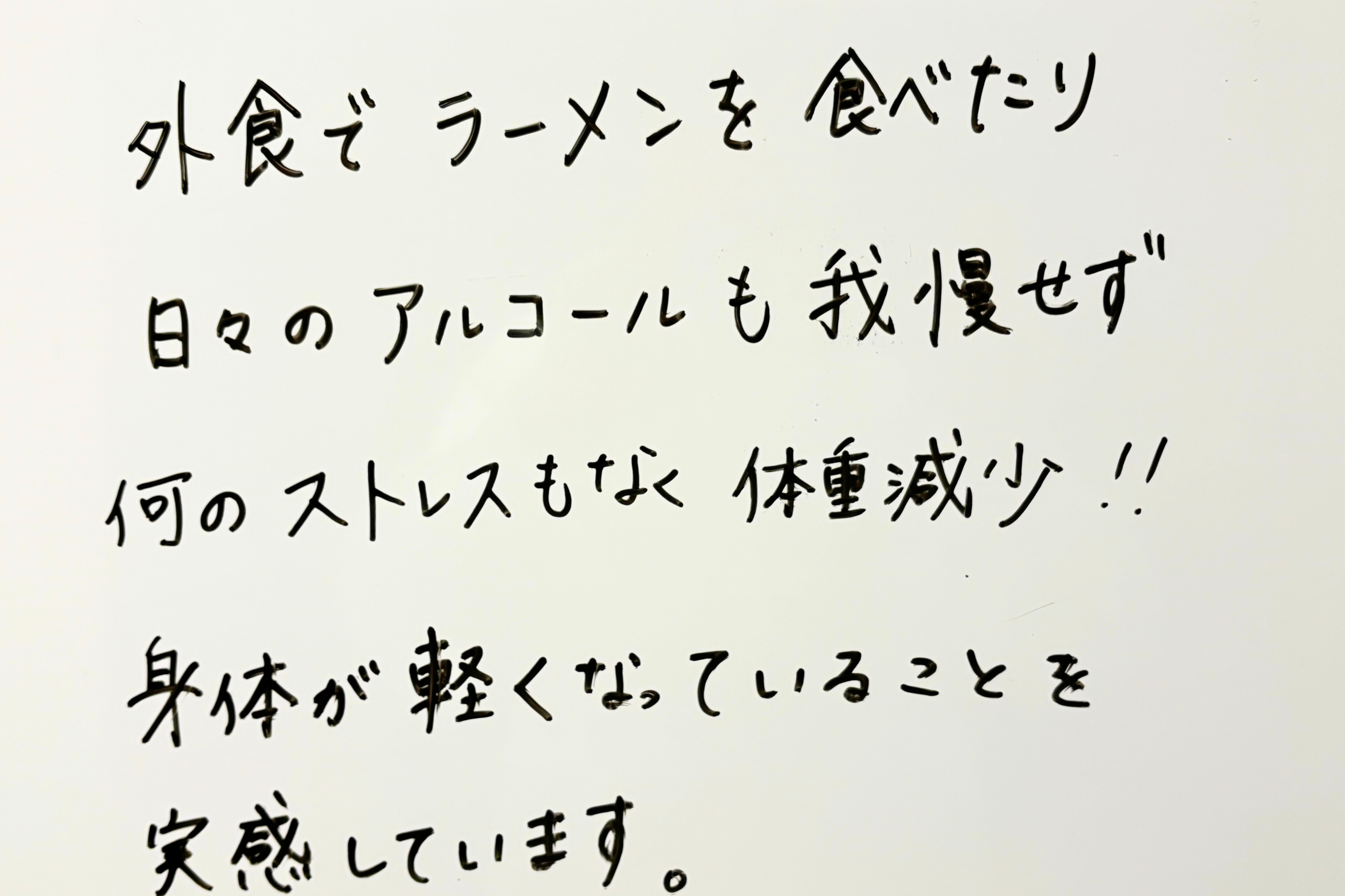 外食でラーメンを食べたり 日々のアルコールも我慢せず何のストレスもなく体重減少!! 身体が軽くなっていることを実感します。 |