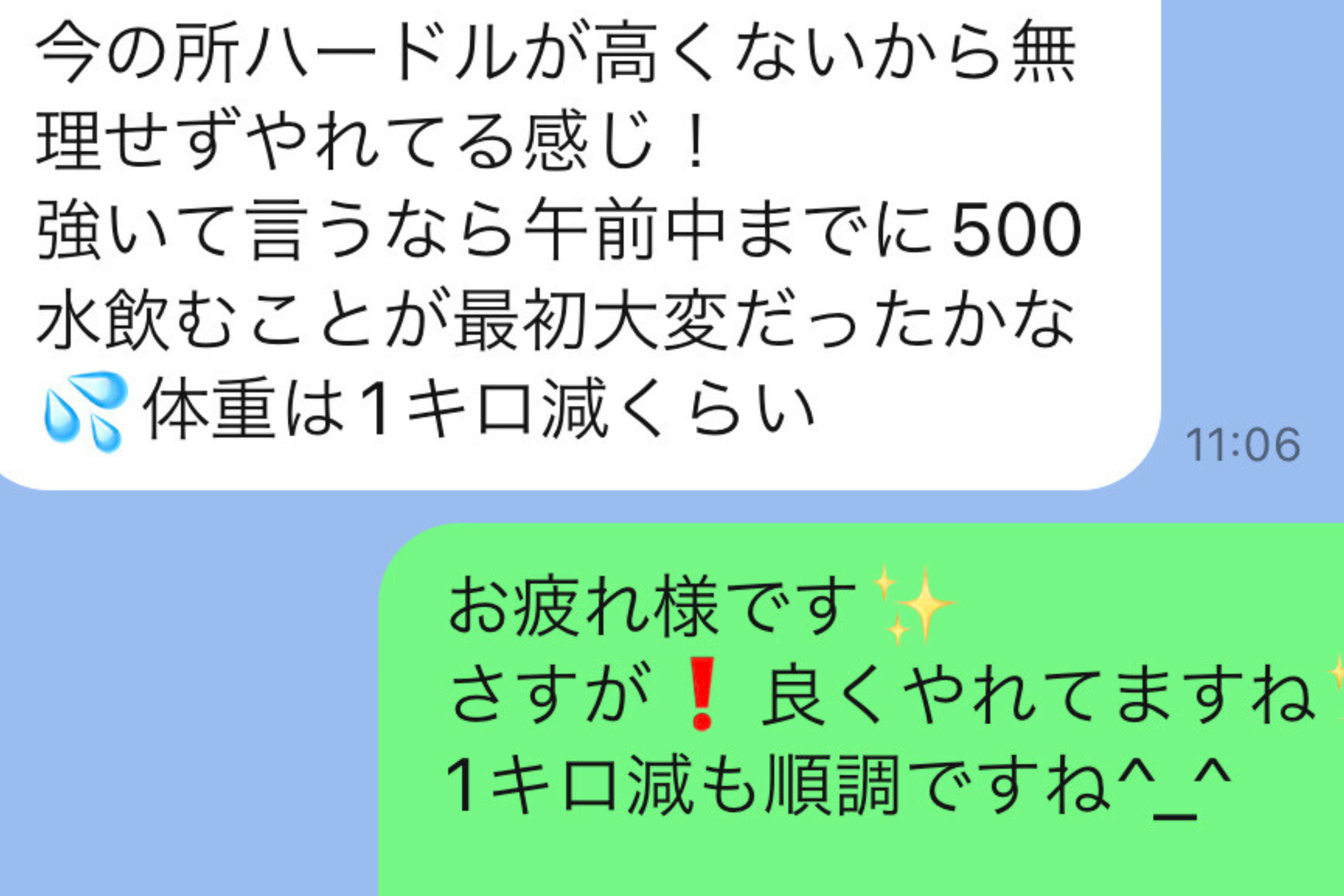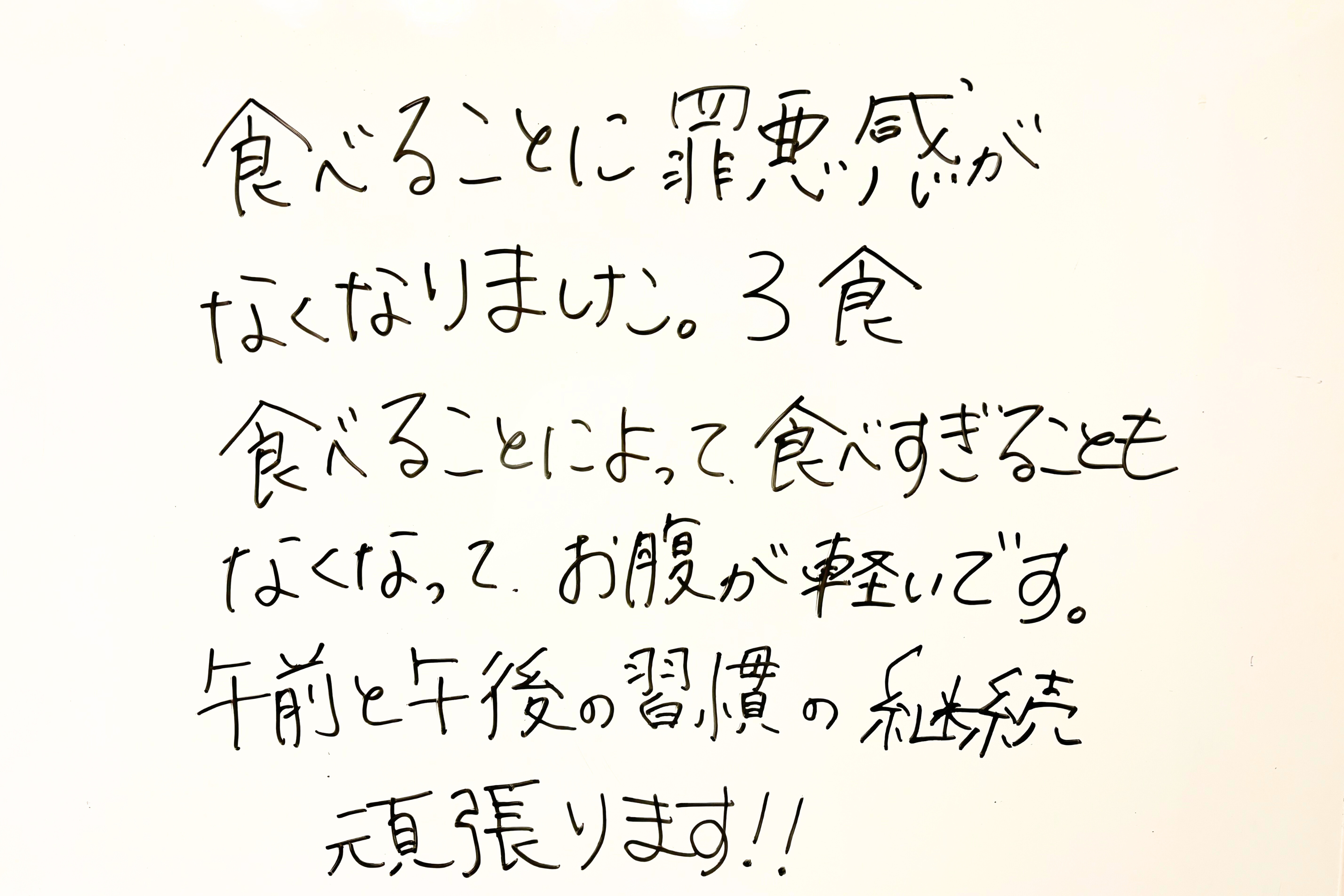 食べることに罪悪感がなくなりました。3食食べることによって、食べ過ぎることもなくなってお腹が軽いです。午前と午後の習慣の継続頑張ります!! |